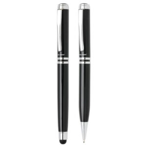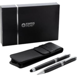 The Swiss Peak Executive Pen Set is a classic and high-quality pen set, packaged in a gift box so it’s easy to gift to clients, staff or executives. Made from heavy brass metal, the set includes a blue ink rollerball pen and blue ink ballpoint pen with stylus tip to navigate touchscreen devices with, each with a silver clip, tip and trim detail and Swiss Peak branding. Includes a premium PU leather pouch for storage. Available in black.