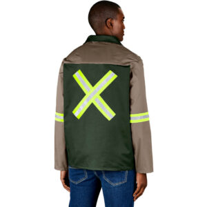 The Site Premium Two-Tone Polycotton Jacket – Reflective Arms & Back – Yellow Tape is a two-tone protective workwear jacket designed to keep your personal clothes free from dirt, spills, or damage with reflective 50mm silver and yellow reflective tape around the armss and a criss-cross on the back to provide visibility in both daytime and nighttime or poorly lit working conditions. Made from 235g/m2 65% polyester 35% cotton twill, this breathable and easy to care for garment is designed to keep its colour no matter how many times you wash it. Features include an open neck collar, front yoke panel, concealed zip with world-renowned YKK metal zip puller, chest pockets with a V-flap and press stud closure, a pen pocket, two side pockets and triple needle stitching with bar tacks at all stress points for added reinforcement against wear and tear. Available in two-tone colours.