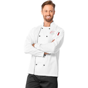 Feel like an executive chef in the Unisex Long Sleeve Toulon Chef Jacket. Made from 195g/m2 65% polyester and 35% cotton, the jacket has a double-breasted front panel with contrasting piping along the panel, collar and cuff and a thermometer pocket on the left sleeve. Available in white with black detail throughout. Standard fit for mens. Relaxed fit for ladies. Available in plain colours.