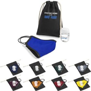 A double-layer earloop face mask and 30ml gel hand sanitiser are presented in a cotton drawstring pouch. A perfect corporate gift to keep your staff safe and healthy.