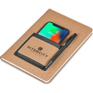 The Moda Gift Set is an office essential to store notes and even your mobile device. Packaged in a black presentation box, the set includes a: A5 Notebook made from PU with a fabric slipcover, convenient pocket on the front to hold your mobile device and a pen. Contains 160 lined pages. Available in plain colours.
